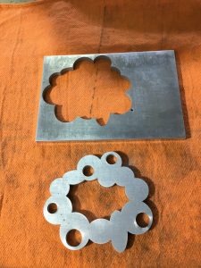 社内にある端材からワイヤー放電加工機を使い、必要な文字や部品をカットしていきます。